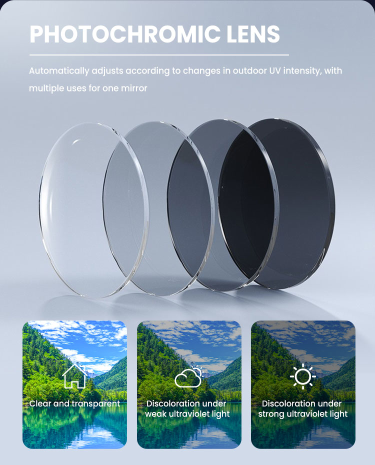 Photochromic lenses (often called “transition lenses”) are change color automatically with light. They stay clear indoors or in low light, but when exposed to sunlight (or UV rays), they darken gradually—like turning into sunglasses.