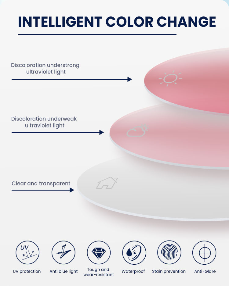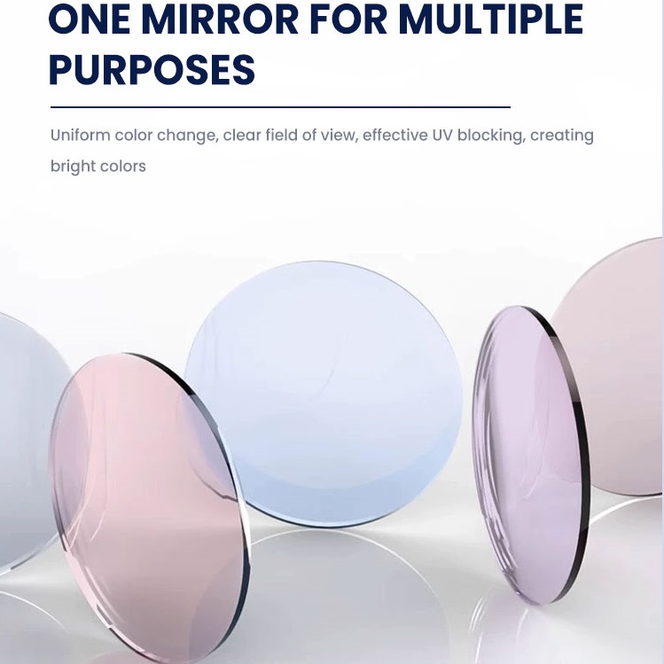Ideal Optical seven-color photochromic lenses are resin lenses designed for light adaptation. They come with 7 color options—brown, yellow, blue, green, purple, gray, and pink—to meet personalized style needs, and can be customized with powers for myopia, hyperopia, or other vision issues.